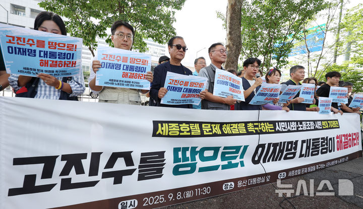 [서울=뉴시스] 김진아 기자 = 8일 서울 용산구 대통령 집무실 앞에서 세종호텔 문제 해결을 촉구하는 시민사회·노동조합·시민연대 기자회견 '고진수를 땅으로!, 이재명 대통령이 해결하라'가 열리고 있다. 2025.09.08. [email protected]
