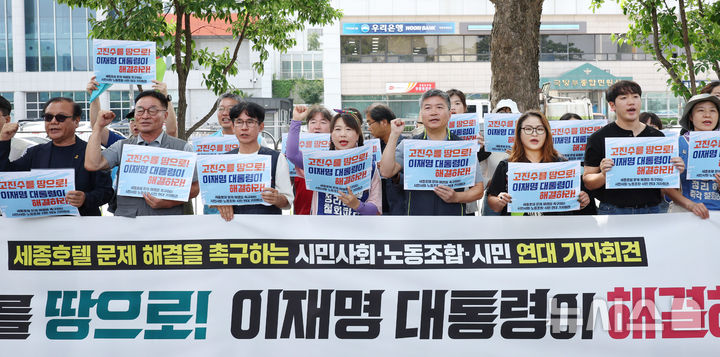 [서울=뉴시스] 김진아 기자 = 8일 서울 용산구 대통령 집무실 앞에서 세종호텔 문제 해결을 촉구하는 시민사회·노동조합·시민연대 기자회견 '고진수를 땅으로!, 이재명 대통령이 해결하라'가 열리고 있다. 2025.09.08. [email protected]