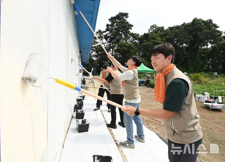 [평택=뉴시스] 김종택 기자 = 8일 경기 평택시 포승읍 신영리에서 열린 사랑의 집고치기 농가희망 봉사활동에서 농협 봉사자들이 담장 도색 작업을 하고 있다. 2025.09.08. [email protected]