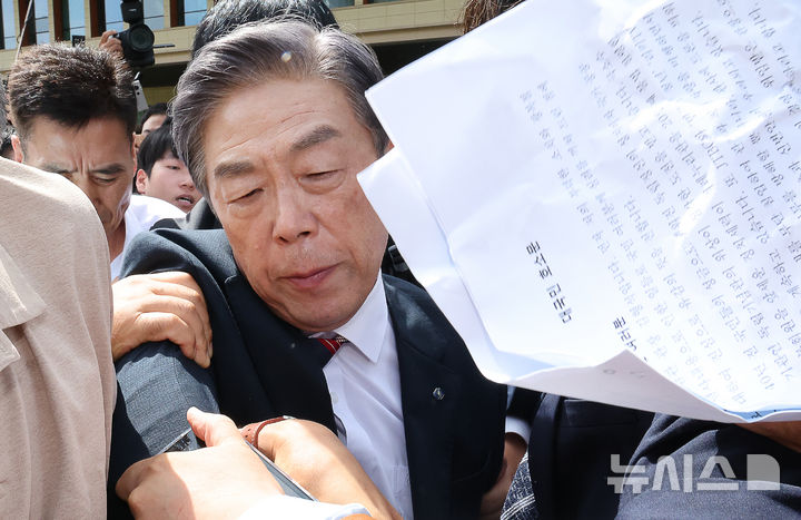 [서울=뉴시스] 김명년 기자 = 김형석 독립기념관장이 8일 오전 서울 여의도 국회 소통관에서 '독립기념관 바로 세우기' 기자회견을 마친 후 시민단체 회원들의 항의를 받으며 차량으로 이동하고 있다. 2025.09.08. [email protected]