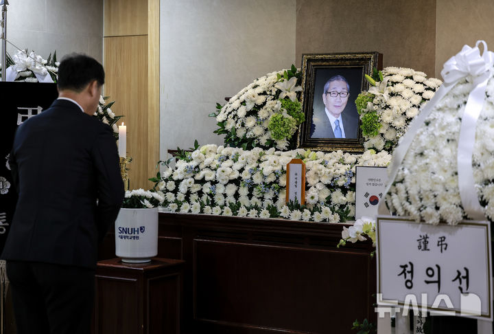[서울=뉴시스] 정병혁 기자 = 8일 서울 종로구 서울대병원 장례식장에 마련된 고 이용일 전 한국야구위원회 총재 직무대행의 빈소를 찾은 조문객이 조문을 하고 있다.