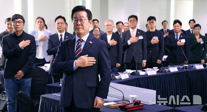 [서울=뉴시스] 고범준 기자 = 이재명 대통령이 8일 서울 중구 서울스퀘어에서 열린 대한민국, AI로 날다 국가인공지능(AI) 전략위원회 출범식에서 국민의례를 하고 있다. (대통령실통신사진기자단) 2025.09.08. [email protected]