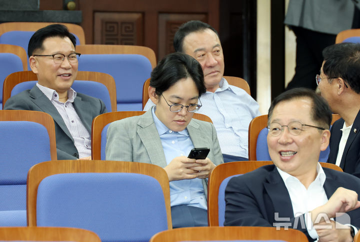 [서울=뉴시스] 고승민 기자 = 조지연 국민의힘 의원이 8일 서울 여의도 국회에서 열린 의원총회에서 시작 전 휴대폰을 보고 있다. 2025.09.08. [email protected]