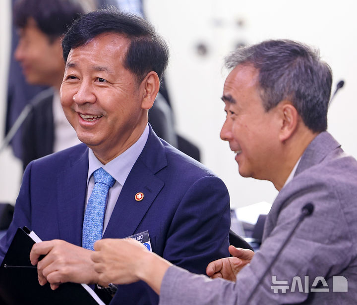 [서울=뉴시스] 고범준 기자 = 구윤철 경제부총리 겸 기획재정부 장관이 8일 서울 중구 서울스퀘어에서 열린 대한민국, AI로 날다 국가인공지능(AI) 전략위원회 출범식에서 임문영 부위원장과 대화를 하고 있다. (대통령실통신사진기자단) 2025.09.08. [email protected]