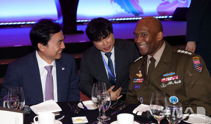 [서울=뉴시스] 홍효식 기자 = 안규백 국방부 장관과 제이비어 브런슨 유엔군사령관이 8일 오후 서울 중구 웨스틴조선호텔에서 열린 유엔사 창설 75주년 기념행사에 참석해 대화하고 있다. 2025.09.08. [email protected]
