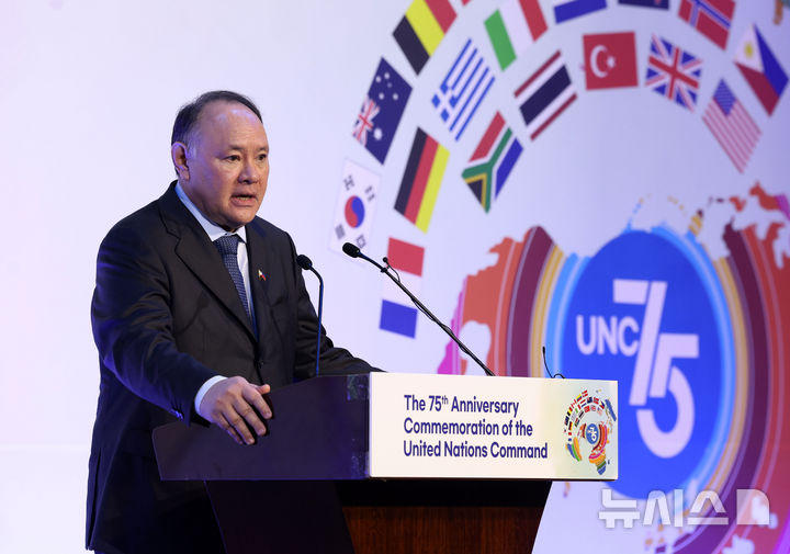 [서울=뉴시스] 홍효식 기자 = 길버트 테오도로 필리핀 국방장관이 8일 오후 서울 중구 웨스틴조선호텔에서 열린 유엔사 창설 75주년 기념행사에서 축사하고 있다. 2025.09.08. [email protected]