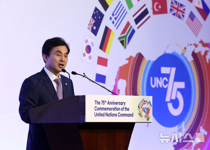 [서울=뉴시스] 홍효식 기자 = 안규백 국방부 장관이 8일 오후 서울 중구 웨스틴조선호텔에서 열린 유엔사 창설 75주년 기념행사에서 환영사하고 있다. 2025.09.08. [email protected]