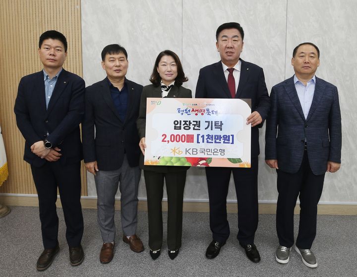 [청주=뉴시스] KB국민은행 충청지역영업그룹이 9일 충북 청주시에 1000만원 상당의 2025 청원생명축제 입장권 2000장을 기탁하고 있다. 축제 기간 농축산물 구입용으로 쓸 수 있는 입장권은 지역 내 취약계층에게 전달될 예정이다. 왼쪽부터 KB국민은행 안병환 청주종합금융센터 지점장, 김근태 충청(청주) 지역본부장, 장문자 충청지역영업그룹 대표, 이범석 청주시장, 박용국 농업정책국장. (사진=청주시 제공) 2025.09.09. [email protected]