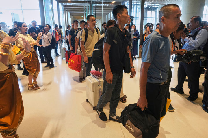 [프놈펜=AP/뉴시스] 9일(현지 시간) 캄보디아 프놈펜 외곽에 있는 떼쪼 국제공항(KTI)에 도착한 첫 여객기 승객들이 공항 입국장에 들어서면서 환영받고 있다. 지난 2019년 착공한 캄보디아 신공항 'KTI'가 9일 1단계 운항에 들어갔으며 공식 개장은 10월 20일로 예정돼 있다. 2025.09.09.