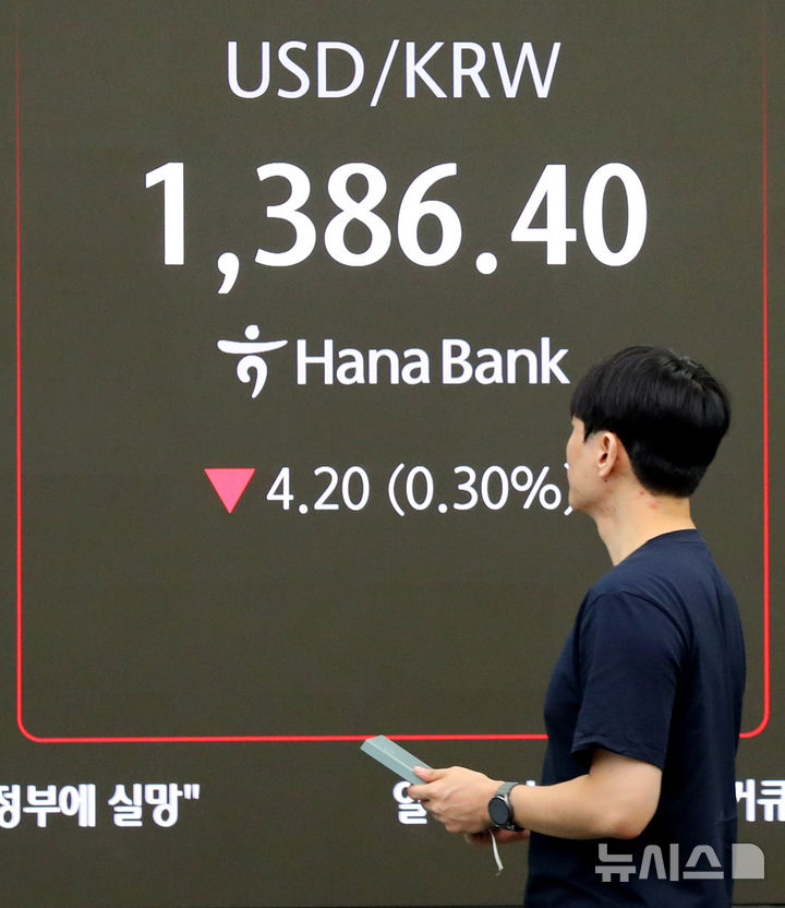 [서울=뉴시스] 김혜진 기자 = 원·달러 환율은 전 거래일(1390.6원)보다 4.1원 내린 1386.5원에 개장한 9일 오전 서울 중구 하나은행 딜링룸 전광판에 지수가 표시되고 있다.