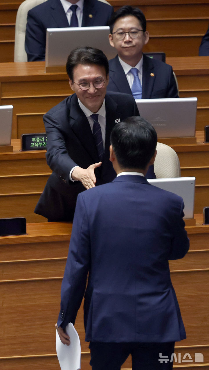 [서울=뉴시스] 김금보 기자 = 정청래 더불어민주당 대표가 9일 오전 서울 여의도 국회에서 열린 제429회국회(정기회) 제2차 본회의에서 교섭단체 대표연설을 마친 후 김민석 국무총리와 악수를 하고 있다. 2025.09.09. [email protected]