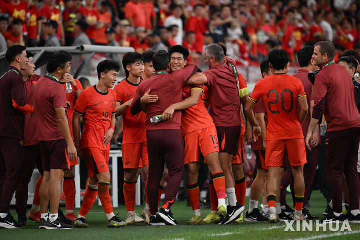 [시안=신화/뉴시스] 중국 23세 이하(U-23) 남자 축구 대표단이 9일(현지 시간) 중국 산시성 시안의 시안 스포츠 트레이닝 센터에서 열린 2026 아시아축구연맹(AFC) U-23 아시안컵 예선 D조 3차전 호주와의 경기를 마친 후 본선 진출에 환호하고 있다. 중국은 호주와 0-0으로 비겨 2승1무로 조 2위를 기록, 각 조 2위 중 가장 좋은 성적을 거둬 내년 1월 사우디아라비아에서 열리는 아시안컵 본선에 진출했다. 2025.09.10.