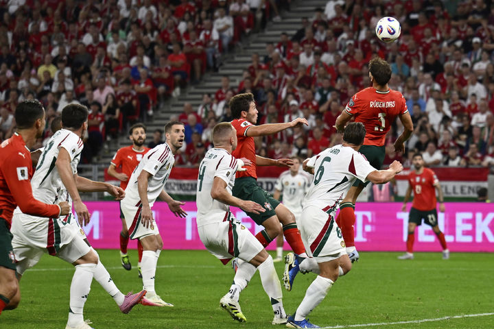 [부다페스트=AP/뉴시스] 포르투갈의 후벵 디아스(오른쪽)가 9일(현지 시간) 헝가리 부다페스트 푸스카스 아레나에서 열린 2026 국제축구연맹(FIFA) 북중미 월드컵 유럽 예선 F조 2차전 헝가리와 경기 중 공중 볼을 다루고 있다. 포르투갈이 3-2로 승리하며 조 선두를 수성했다. 2025.09.10.