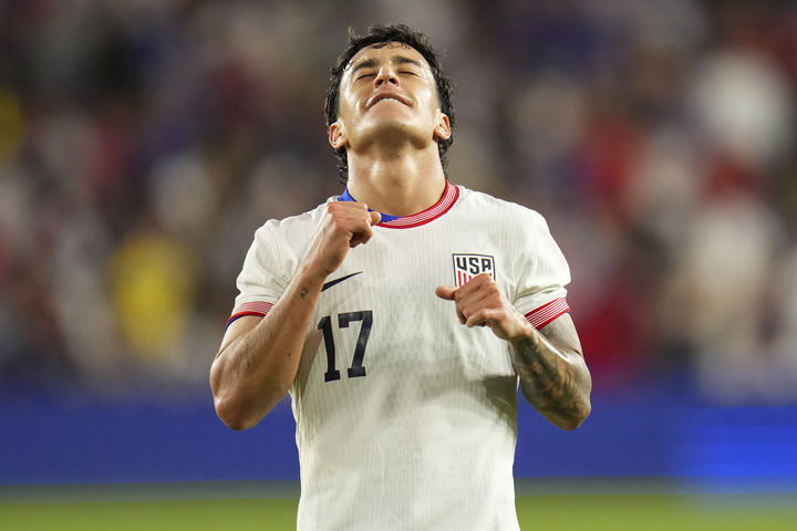 [콜럼버스=AP/뉴시스] 미국의 알레한드로 센데하스가 9일(현지 시간) 미 오하이오주 콜럼버스의 로워닷컴필드에서 열린 일본과의 친선 축구 경기 전반 30분 선제골을 넣고 기뻐하고 있다. 미국이 1-0으로 앞선 채 전반전을 마쳤다. 2025.09.10.