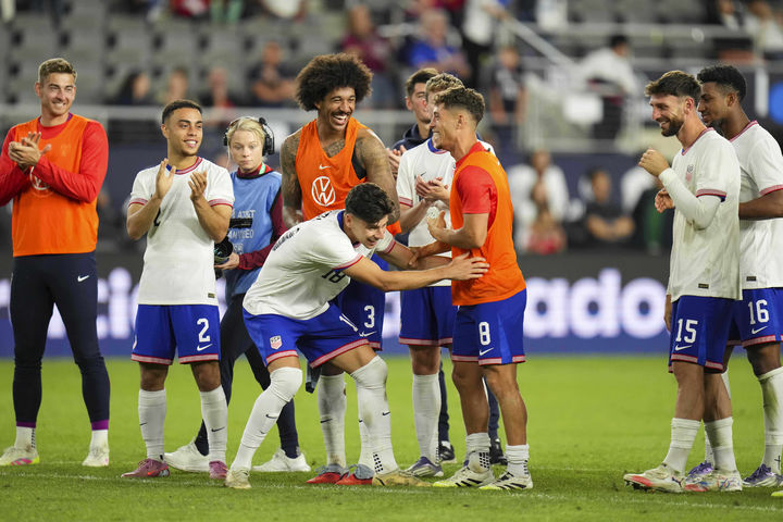 [콜럼버스=AP/뉴시스] 미국 선수들이 9일(현지 시간) 미 오하이오주 콜럼버스의 로워닷컴필드에서 열린 일본과의 친선 축구 경기를 2-0 승리로 마친 후 자축하고 있다. 2025.09.10.