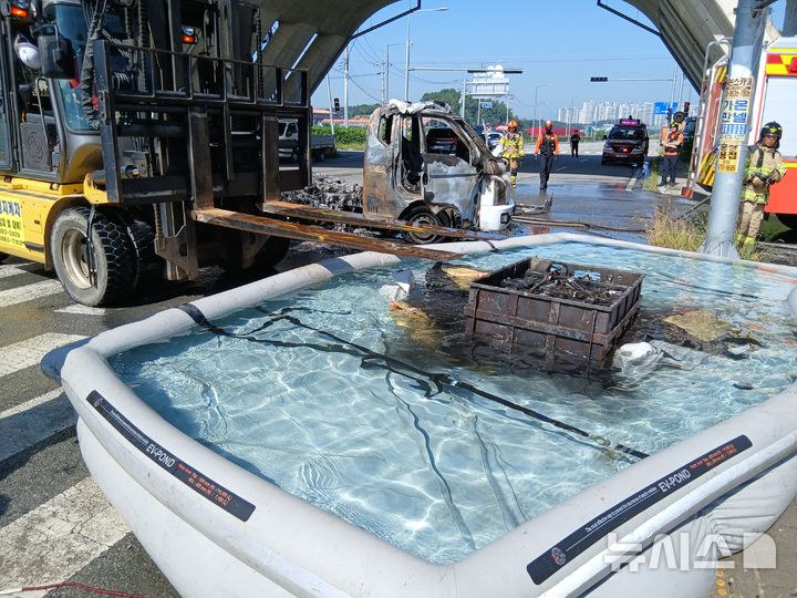 [음성=뉴시스] 10일 오전 9시32분께 충북 음성군 금왕읍의 한 도로에서 주행 중이던 1t 화물차에서 화재가 발생해 소방당국이 차량 적재함에 실린 배터리팩을 이동용 수조로 옮겨 폭발 피해를 사전 차단하고 있다. (사진=음성소방서 제공) 2025.09.10. [email protected]