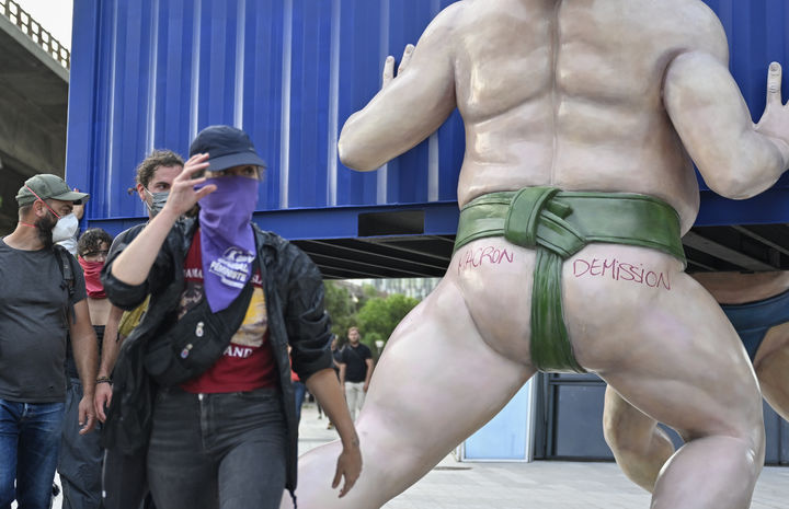 [마르세유=AP/뉴시스] 10일(현지 시간) 프랑스 마르세유에서 ‘모든 걸 막아라'(Block Everything) 시위가 열려 시위대가 "마크롱 퇴진"이라는 낙서가 쓰인 스모 선수 조형물 옆을 지나고 있다. 총리 이임식이 열리는 이날 프랑스 전역에서 대규모 반정부 시위가 열렸다. 2025.09.10.