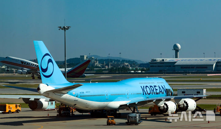 [서울=뉴시스] 김선웅 기자 = 미국 조지아주 현대차그룹-LG에너지솔루션 배터리 합작 공장 건설 현장에서 구금된 한국인들을 태울 대한항공 B747-8i 전세기가 10일 오전 인천국제공항 2터미널 계류장에서 이륙을 준비하고 있다. 체포·구금된 한국인 300여명은 현지시간으로 10일 오후 2시 30분(한국시간 11일 오전 3시 30분) 전후 현지에서 출발할 것으로 전해졌다. (공동취재). 2025.09.10. [email protected]