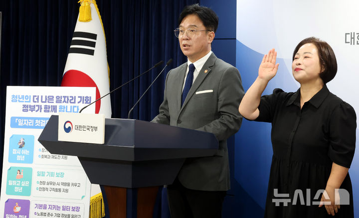 [서울=뉴시스] 추상철 기자 = 김영훈 고용노동부 장관이 10일 오후 서울 종로구 정부서울청사에서 열린 청년 일자리 대책 '일자리 첫걸음 보장제 추진방안' 발표 브리핑을 하고 있다. 2025.09.10. [email protected]