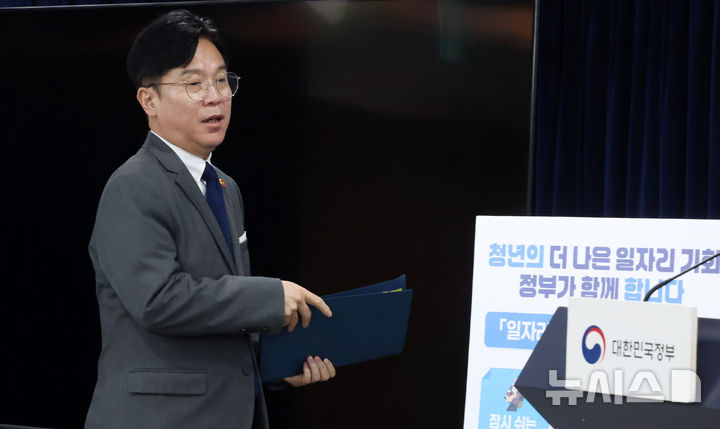 [서울=뉴시스] 추상철 기자 = 김영훈 고용노동부 장관이 10일 오후 서울 종로구 정부서울청사에서 열린 청년 일자리 대책 '일자리 첫걸음 보장제 추진방안' 발표 브리핑을 위해 단상으로 향하고 있다. 2025.09.10. [email protected]