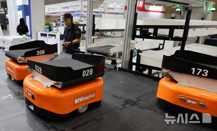[고양=뉴시스] 전진환 기자 = 5일 오전 경기도 고양시 킨텍스에서 열린 제5회 유통·물류 및 공급망관리 산업전을 찾은 관람객이 물류 분류 무인운반차량의 시연을 지켜보고 있다. 2025.09.10. [email protected]