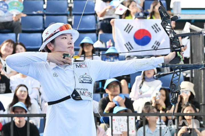 [광주=뉴시스] 이영주 기자 = 10일 오후 광주 동구 5·18민주광장에서 열린 광주2025현대세계양궁선수권대회 리커브 여자 단체전 동메달 결정전, 대한민국 여자 국가대표 강채영이 활시위를 당기고 있다. 2025.09.10. [email protected]