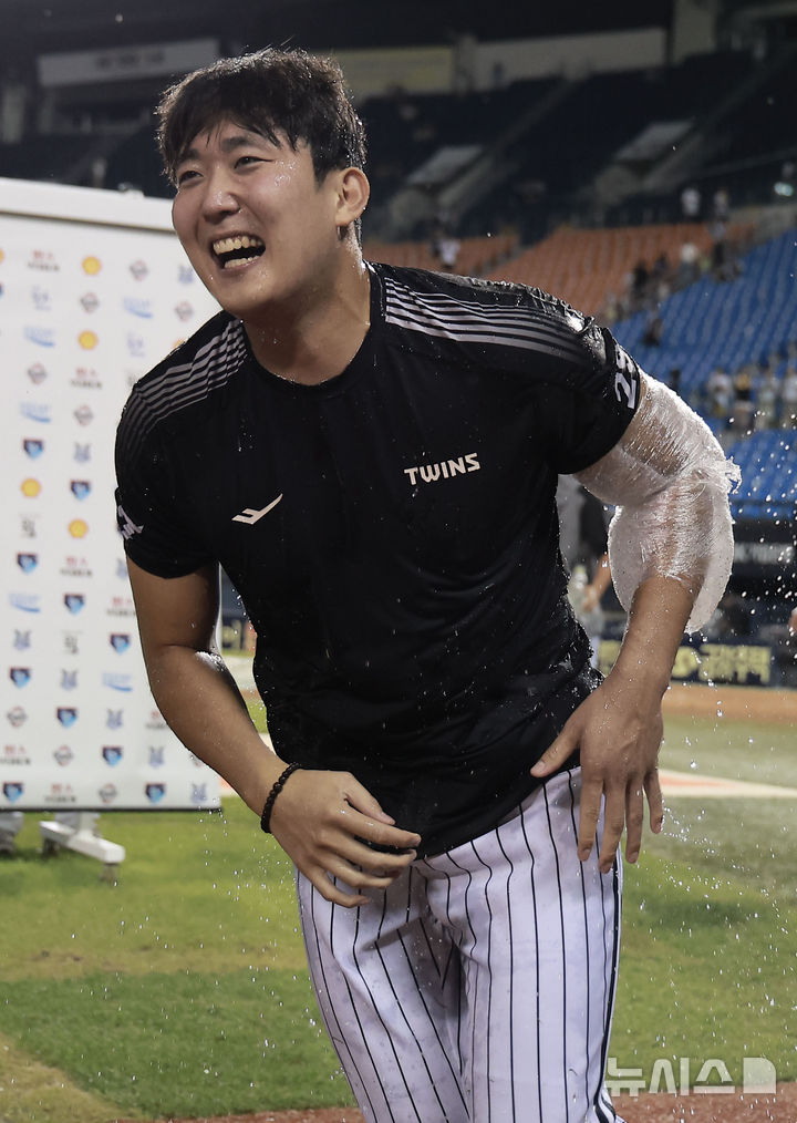 [서울=뉴시스] 정병혁 기자 = 10일 서울 송파구 잠실야구장에서 열린 2025 KBO리그 LG 트윈스 대 두산 베어스의 경기, 8-4으로 승리해 10승을 달성한 LG 손주영이 동료들의 축하를 받고 있다. 2025.09.10. [email protected]