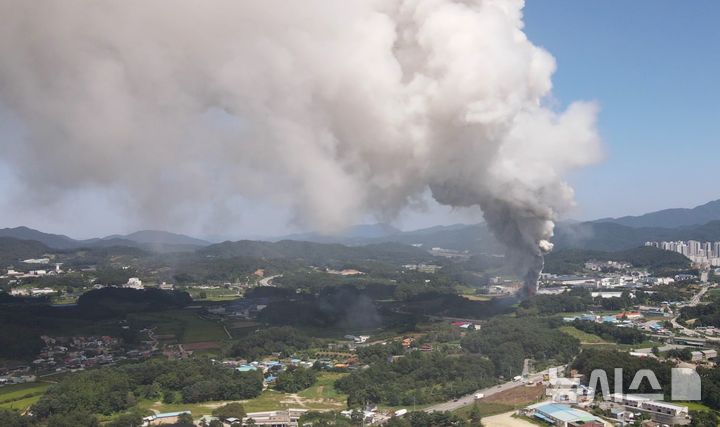 [음성=뉴시스] 11일 낮 12시2분께 충북 음성군 금왕읍 도청리의 한 창고에서 화재가 발생해 연기가 하늘로 치솟고 있다. (사진=독자 제공) 2025.09.11. [email protected]