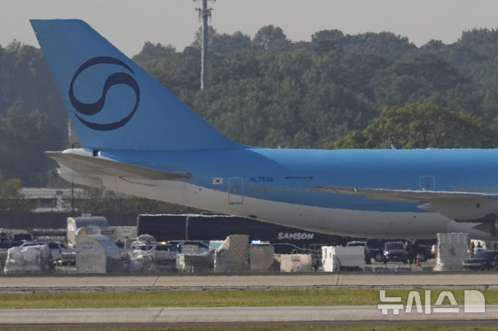[애틀랜타(미국)=AP/뉴시스] 11일(현지시간) 미국 조지아주 애틀랜타 하츠필드-잭슨 국제공항에 미국 이민 당국의 단속으로 체포된 현대차-LG엔솔 한국인 근로자 300여 명이 탑승한 버스가 도착하고 있다. 2025.09.11.