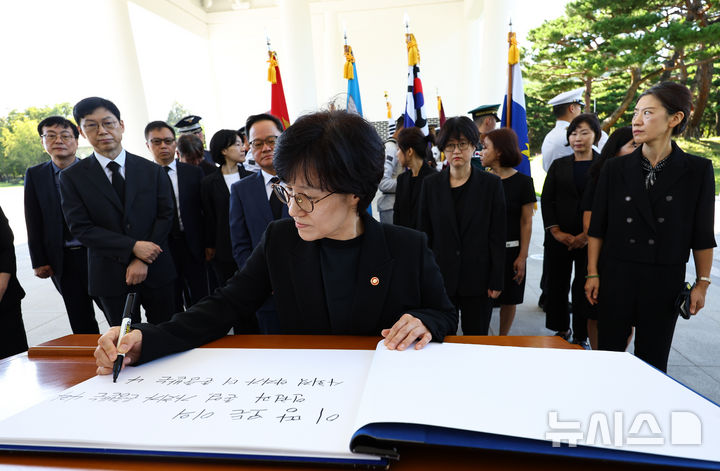 [서울=뉴시스] 최진석 기자 = 원민경 신임 여성가족부 장관이 11일 서울 동작구 국립서울현충원을 찾아 현충탑에 참배 뒤 방명록을 작성하고 있다. 2025.09.11. [email protected]