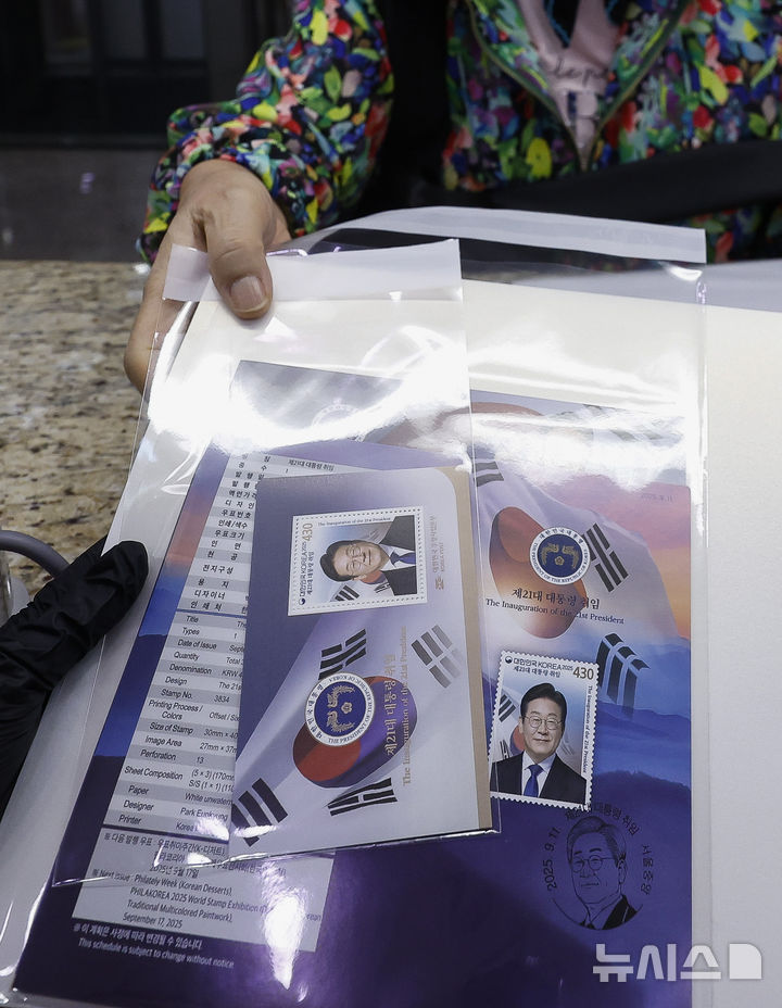 이 대통령의 취임 100일을 맞아 발행된 기념우표는 전지 22만 장(낱장 328만 장), 소형시트 45만 장, 기념우표첩 5만 부이다. 우표와 소형시트의 가격은 430원, 기념우표첩은 2만 7000원이다. 전국 총괄우체국과 인터넷우체국 등에서 구매할 수 있다. (공동취재) 2025.09.11. [email protected]