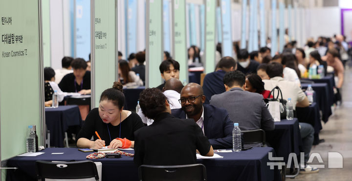 [고양=뉴시스] 권창회 기자 = 11일 경기 고양시 킨텍스에서 열린 2025 K-뷰티엑스포 코리아에서 외국인 바이어들이 무역관에서 상담을 받고 있다. 2025.09.11. [email protected]