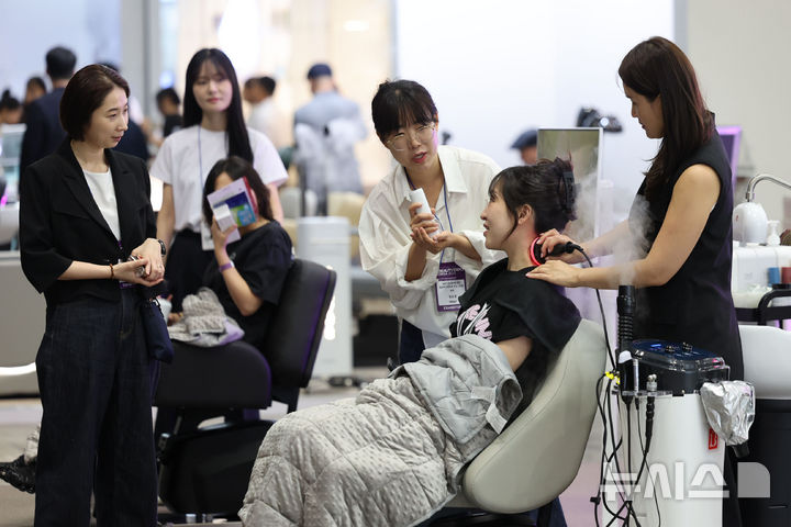 [고양=뉴시스] 권창회 기자 = 11일 경기 고양시 킨텍스에서 열린 2025 K-뷰티엑스포 코리아에서 관람객들이 뷰티용품을 체험하고 있다. 2025.09.11. [email protected]