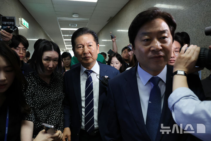 [서울=뉴시스] 김명년 기자 = 정청래 더불어민주당 대표가 11일 오후 서울 여의도 국회에서 의원총회 참석을 위해 이동하던 중 취재진에게 둘러쌓여 있다. 2025.09.11. [email protected]