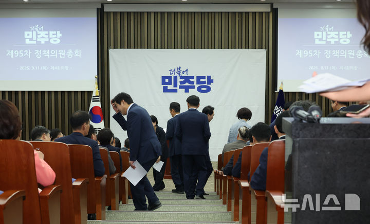 [서울=뉴시스] 고승민 기자 = 더불어민주당 정청래 대표와 김병기 원내대표 등 의원들이 11일 서울 여의도 국회에서 열린 비공개 정책의원총회에 참석하고 있다. 2025.09.11. [email protected]