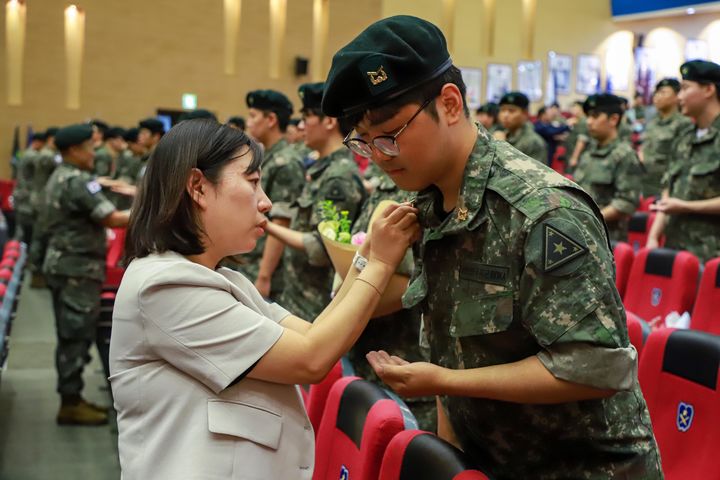 [서울=뉴시스] 11일 충북 괴산 육군학생군사학교에서 열린 '예비역 하사 임용식'에서 예비역 하사로 임용한 인원들에게 가족들이 계급장을 달아주고 있다. (사진=육군 제공) 2025.09.11. [email protected] *재판매 및 DB 금지