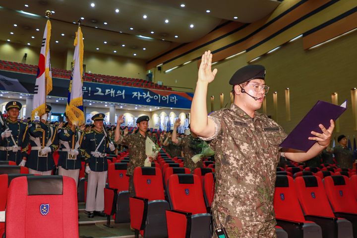 [서울=뉴시스] 11일 충북 괴산 육군학생군사학교에서 열린 '예비역 하사 임용식'에서 예비역 하사로 임용한 인원들이 임용선서를 하고 있다. (사진=육군 제공) 2025.09.11. [email protected] *재판매 및 DB 금지