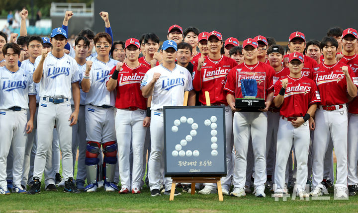 [대구=뉴시스] 이무열 기자 = 11일 대구 수성구 삼성라이온즈파크에서 열린 2025 신한 SOL 뱅크 KBO 리그 SSG 랜더스와 삼성 라이온즈의 경기 시작에 앞서 열린 오승환 은퇴투어 기념행사에서 삼성 오승환이 양 팀 선수들과 기념촬영을 하고 있다. 2025.09.11. [email protected]