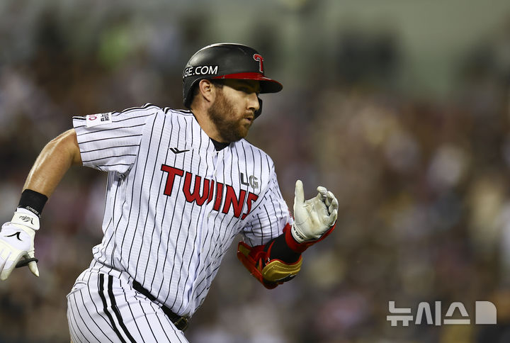 [서울=뉴시스] 김근수 기자 = 11일 서울 송파구 잠실야구장에서 열린 2025 KBO리그 KT 위즈 대 LG 트윈스의 경기, 5회말 2사 주자 없는 상황에서 LG 오스틴이 2루타를 치고 있다. 2025.09.11. [email protected]