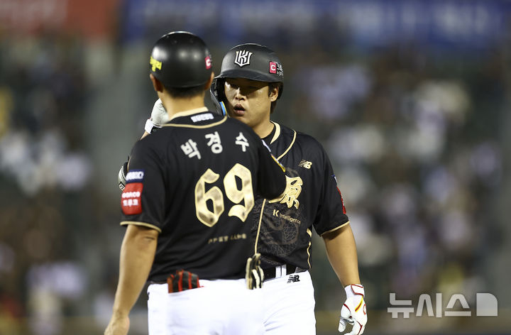 [서울=뉴시스] 김근수 기자 = 11일 서울 송파구 잠실야구장에서 열린 2025 KBO리그 KT 위즈 대 LG 트윈스의 경기, 7회초 1사 주자 1,3루 상황에서 KT 강백호가 1타점 적시타를 치고 기뻐하고 있다. 2025.09.11. [email protected]