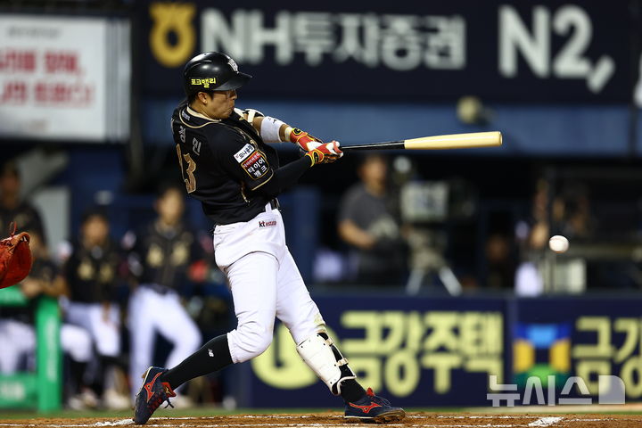 [서울=뉴시스] 김근수 기자 = 11일 서울 송파구 잠실야구장에서 열린 2025 KBO리그 KT 위즈 대 LG 트윈스의 경기, 7회초 2사 주자 1,2루 상황에서 KT 허경민이 안타를 치고 있다. 2025.09.11. [email protected]