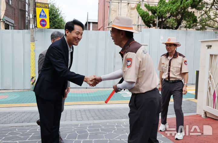 [서울=뉴시스] 김혜진 기자 = 초등학생 등하굣길 안전 관련 현장방문에 나선 오세훈 서울시장이 12일 서울 광진구 양남초등학교 찾아 학교 보안관과 인사를 나누고 있다. (공동취재) 2025.09.12. [email protected]