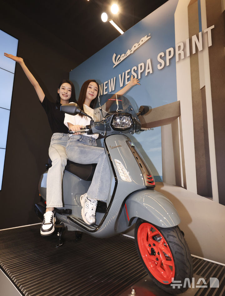 [서울=뉴시스] 김근수 기자 = 12일 서울 강남구 베스파 모토플렉스 서울점에서 열린 이탈리아 아이코닉 브랜드 베스파(VESPA) 신모델 출시 행사에서 모델들이 베스파 스프린트 S 앞에서 포즈를 취하고 있다.