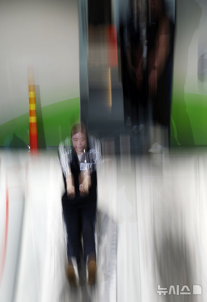 [부산=뉴시스] 하경민 기자 = 12일 부산 강서구 에어부산 사옥 훈련시설에서 신입 객실승무원들이 비상탈출 모의훈련을 하고 있다.