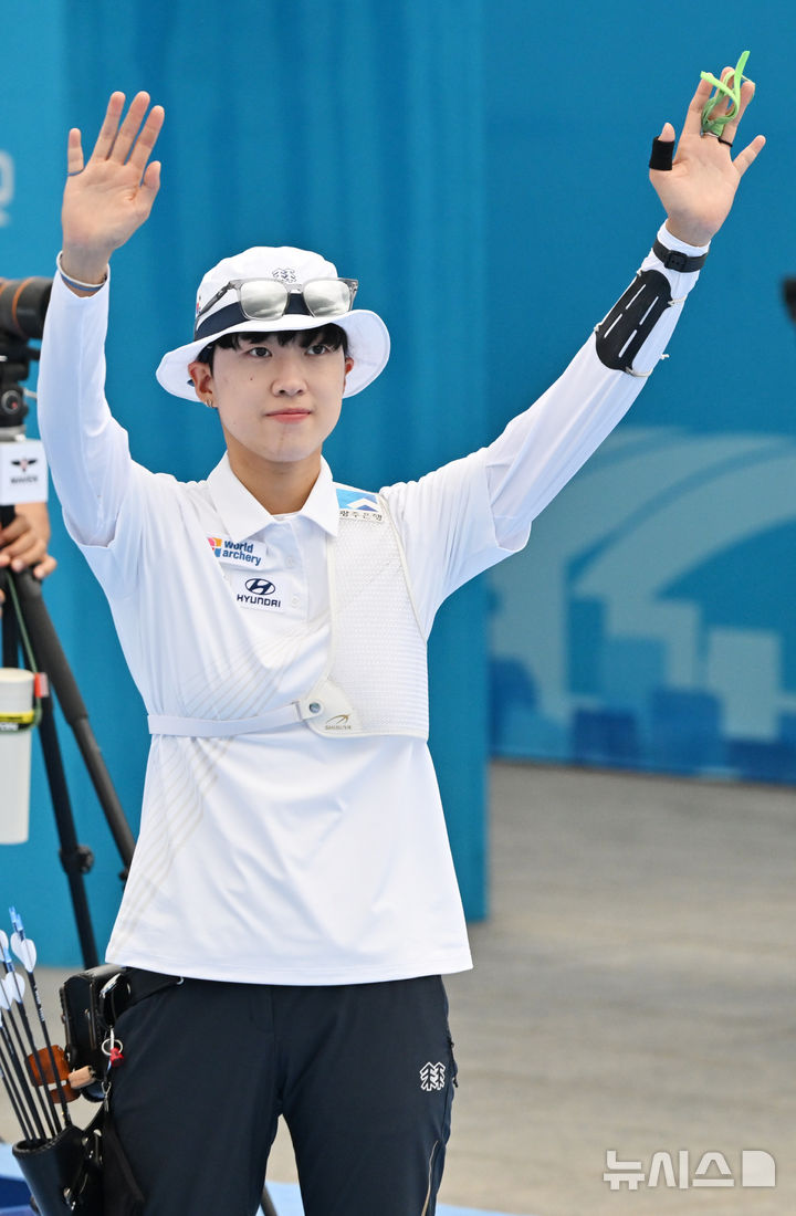 [광주=뉴시스] 이영주 기자 = 12일 오전 광주 동구 5·18민주광장에서 열린 광주2025현대세계양궁선수권대회 리커브 여자 개인전 16강, 대한민국 국가대표 안산(광주은행)이 관중석으로 들어서며 인사하고 있다. 2025.09.12. [email protected]