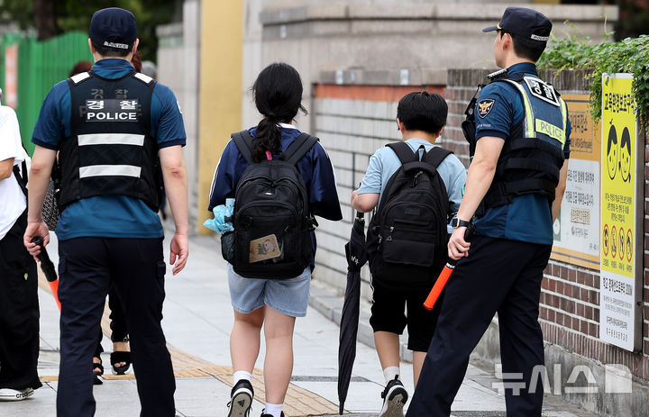 [대구=뉴시스] 이무열 기자 = 초등학생 납치 미수 등 아동 대상 범죄가 잇따르는 가운데 12일 대구 동구 한 초등학교 앞에서 동촌지구대, 기동순찰대가 예방 순찰을 하고 있다. 2025.09.12. [email protected]