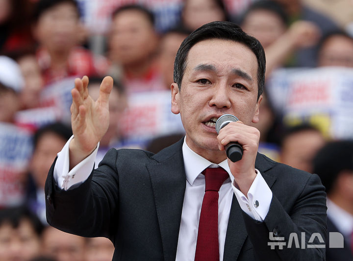 [서울=뉴시스] 김명년 기자 = 김민수 국민의힘 최고위원이 12일 오후 서울 여의도 국회에서 열린 '야당탄압 독재정치 규탄대회'에서 연설을 하고 있다. 2025.09.12. [email protected]