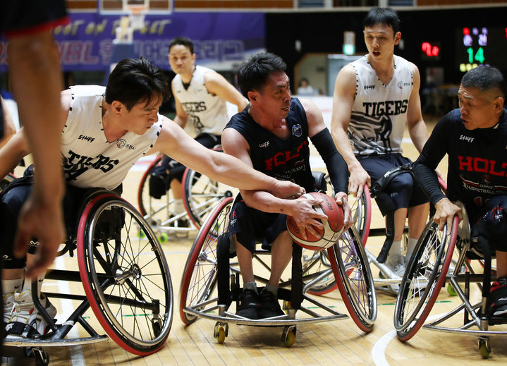[서울=뉴시스] 12일 오후 제주 한라체육관에서 열린 '2025 KWBL 휠체어농구리그' 춘천타이거즈와 고양홀트 경기에서 고양 김한종(오른쪽)과 춘천 조요한이 치열하게 볼 다툼을 하고 있다. (사진=한국휠체어농구연맹 제공) 2025.09.12. [email protected] *재판매 및 DB 금지