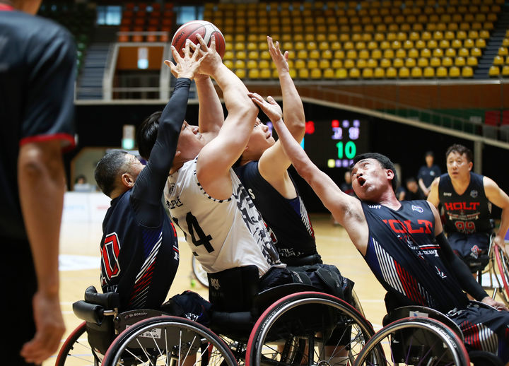 [서울=뉴시스] 12일 오후 제주 한라체육관에서 열린 '2025 KWBL 휠체어농구리그' 춘천타이거즈와 고양홀트 경기에서 춘천 조요한이 수비수들 사이에서 슛을 쏘고 있다. (사진=한국휠체어농구연맹 제공) 2025.09.12. [email protected] *재판매 및 DB 금지
