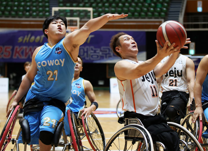 [서울=뉴시스] 12일 오후 제주 한라체육관에서 열린 '2025 KWBL 휠체어농구리그' 제주특별자치도와 코웨이블루휠스 경기에서 제주 한상민(오른쪽)이 코웨이 윤석훈의 수비를 피해 슛을 쏘고 있다. (사진=한국휠체어농구연맹 제공) 2025.09.12. [email protected] *재판매 및 DB 금지